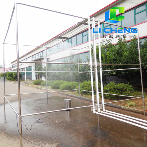 噴霧單元由供水管路、直管段、噴嘴、支架等組成,噴嘴采用世界上專業(yè)生產(chǎn)模擬雨滴噴頭的美國(guó)SPAYING SYSTEMS公司生產(chǎn)的FULLJET旋轉(zhuǎn)下噴式噴嘴,不銹鋼材質(zhì),噴嘴和直管段集成在一起,噴霧支架為不銹鋼方管結(jié)構(gòu),用來(lái)架設(shè)供水管路和噴嘴。